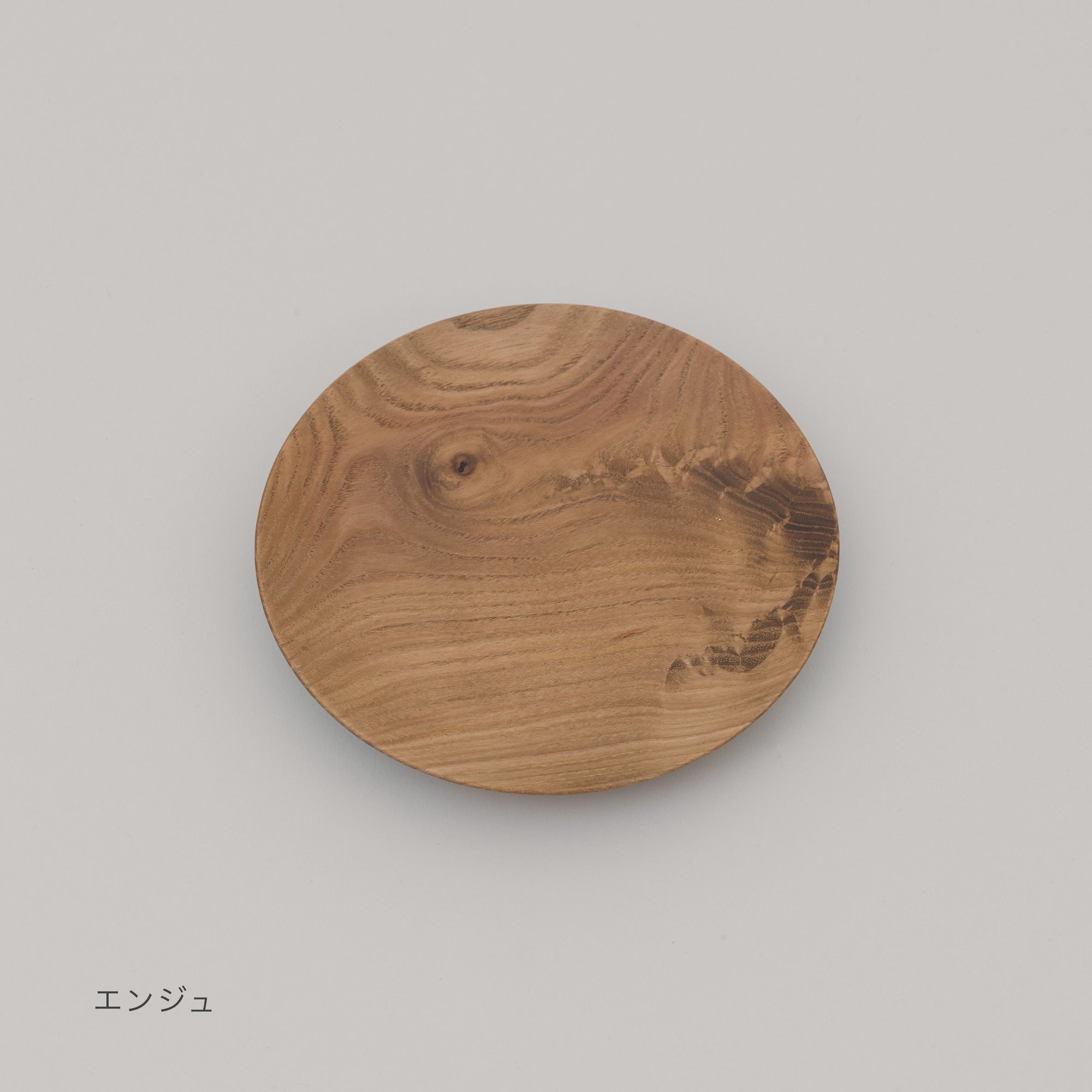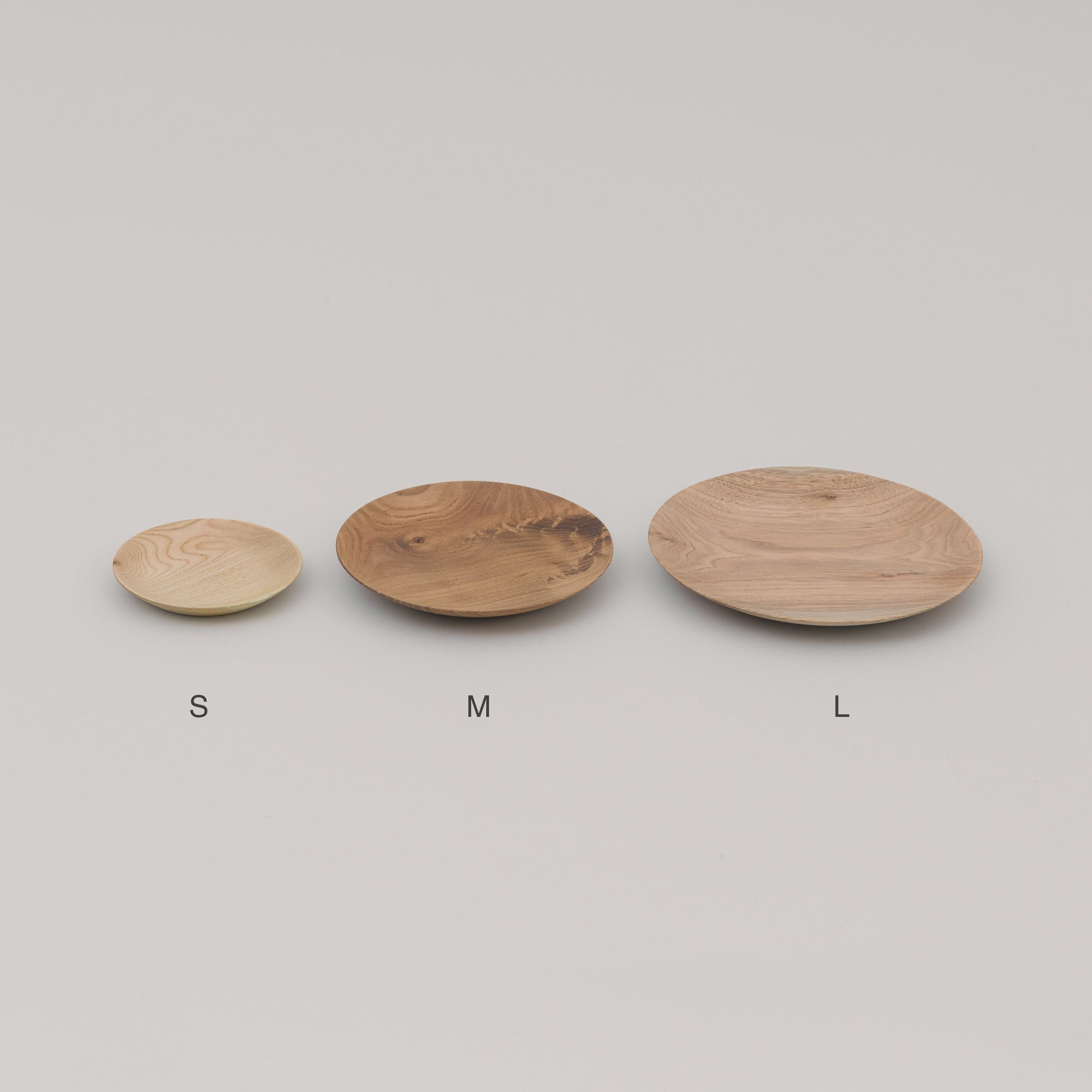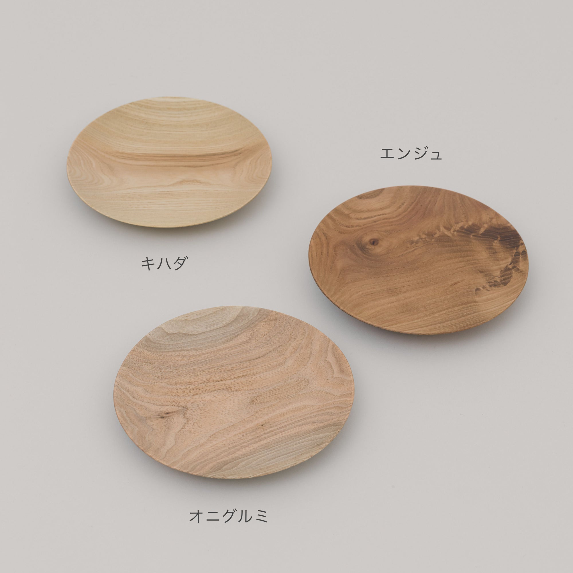 表情の違う3つの樹種キハダ、エンジュ、オニグルミによる平皿。サイズはS、M、Lをご用意しました。Sparkling Sakeに合わせた酒の肴を盛り、食卓で森の息吹を感じてください。